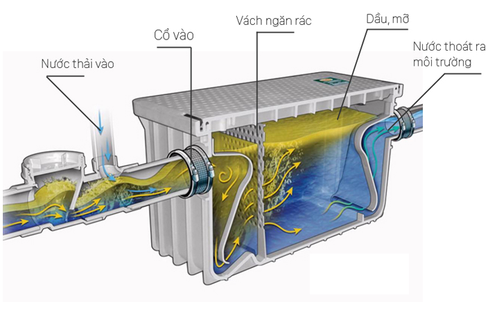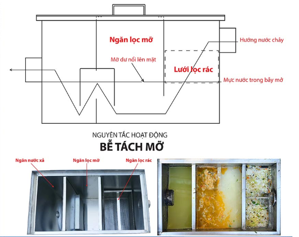 Nước thải từ căn tin, nhà ăn, bếp nấu của nhà hàng, khách sạn, bếp ăn công ty có chứa một lượng dầu, mỡ tương đối lớn sẽ được đưa vào ngăn chứa thứ nhất thông qua sọt rác được thiết kế bên trong, cho phép giữ lại các chất bẩn như các loại thực phẩm, đồ ăn thừa, xương hay các loại tạp chất khác...có trong nước thải. Chức năng này giúp cho bể tách mỡ làm việc ổn định mà không bị nghẹt rác. Sau đó nước thải đi sang ngăn thứ hai, ở đây thời gian lưu dài đủ để mỡ, dầu nổi lên mặt nước.