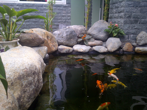 Hồ cá ngoài trời kết hợp non bộ, tiểu cảnh nuôi cá chép, cá Koi, cá tai tượng v.v...