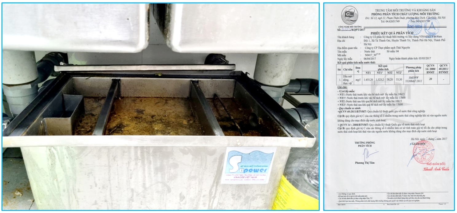 Sản phẩm được nghiên cứu thiết kế và chế tạo bởi Công ty CP Kỹ thuật Môi trường và Xây dựng VINACEE Việt Nam đều cho các kết quả hiệu năng cao khả năng tách dầu mỡ công nghiệp (kiểm tra loại bỏ >95% lượng dầu mỡ).