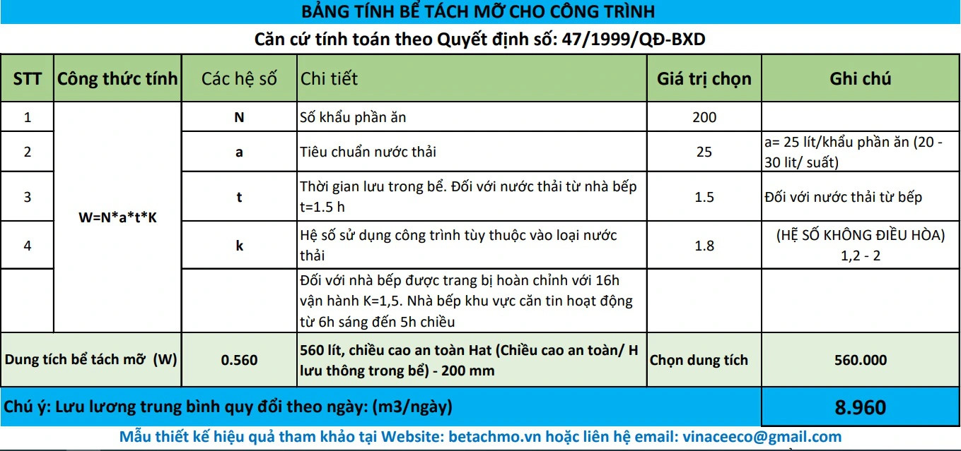 Để có thể tính toán được kích thước bể tách mỡ chuẩn xác, các bạn có thể dựa theo công thức trong Quyết định số 47/1999/QĐ-BXD về “Quy chuẩn hệ thống cấp thoát nước trong nhà và công trình”.