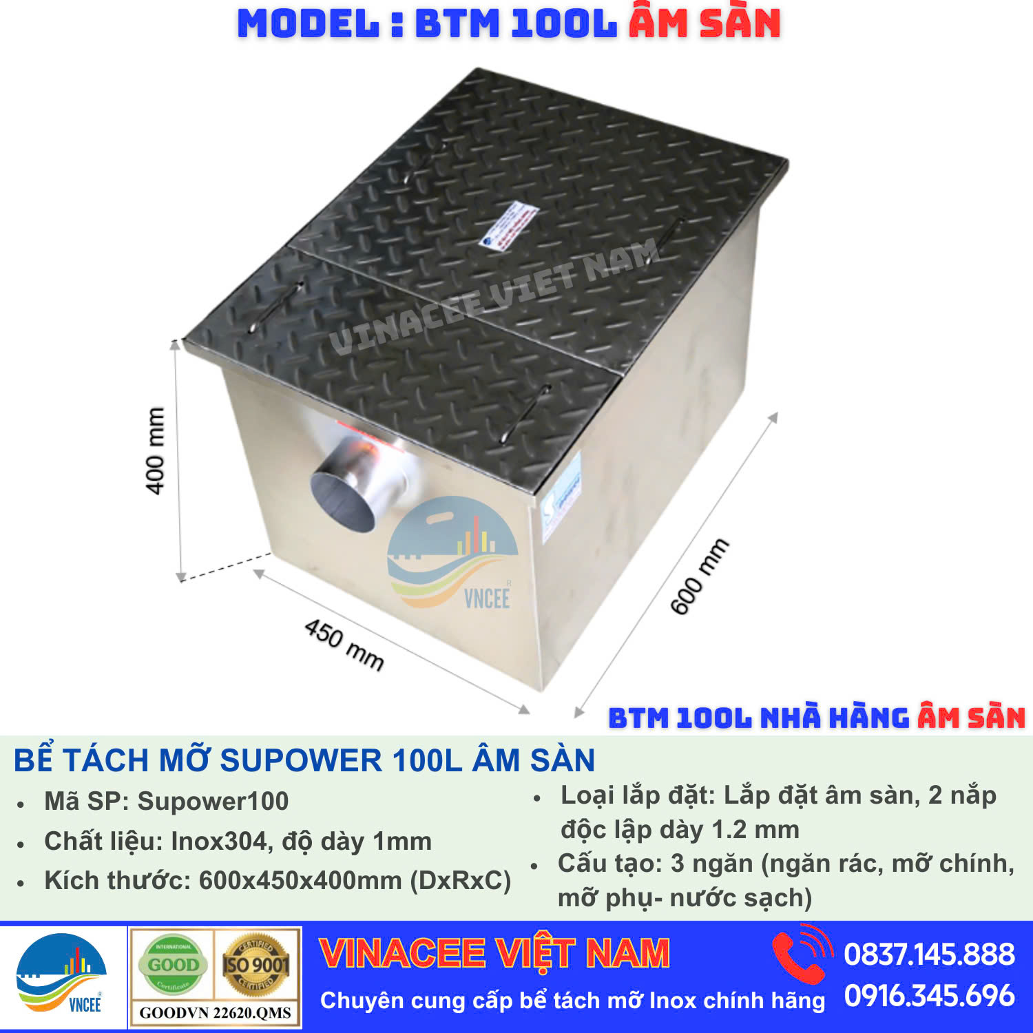 BỂ TÁCH MỠ INOX 304 BẢN TIÊU CHUẨN CHO BẾP ĂN TỪ 50 - 100 SUẤT ĂN