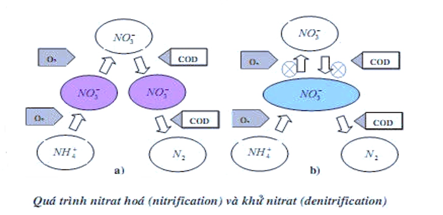 – Amoniac nitơ trong nước thải được chuyển thành nitơ oxy hóa (NO2-N và NO3-N) trong điều kiện hiếu khí trong buồng hiếu khí do tác động của vi khuẩn nitrat. Sau đó, quá trình nitrat hóa lỏng có chứa nitơ oxy hóa được chuyển vào ngăn đầu tiên của buồng lọc kỵ khí bằng một máy bơm chìm. Trong buồng lọc kỵ khí Nitơ oxy hóa bị phá vỡ do vi khuẩn khử nitơ và thải ra không khí nitơ tự do.