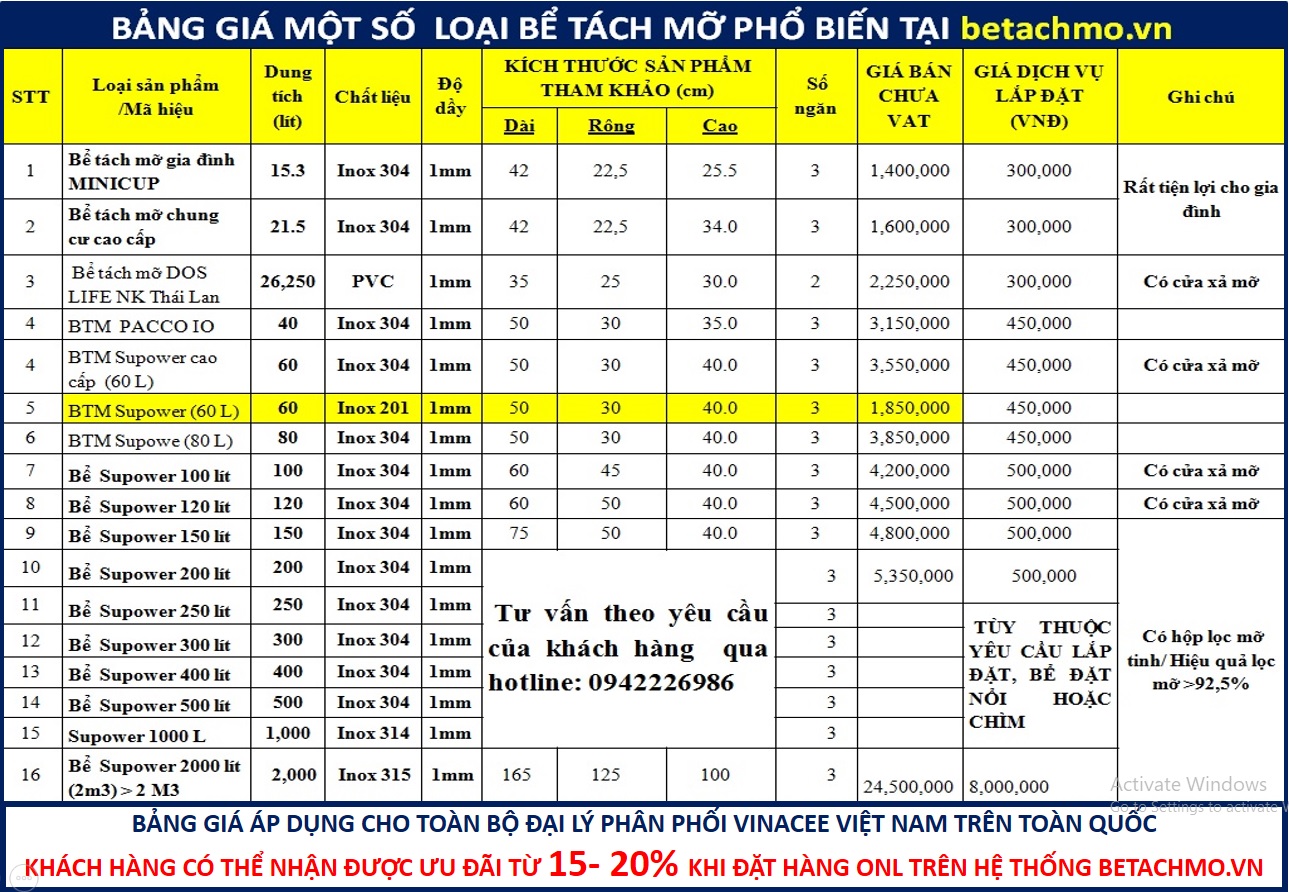 2. Một số thông số kỹ thuật cơ bản và bảng giá của bể tách mỡ