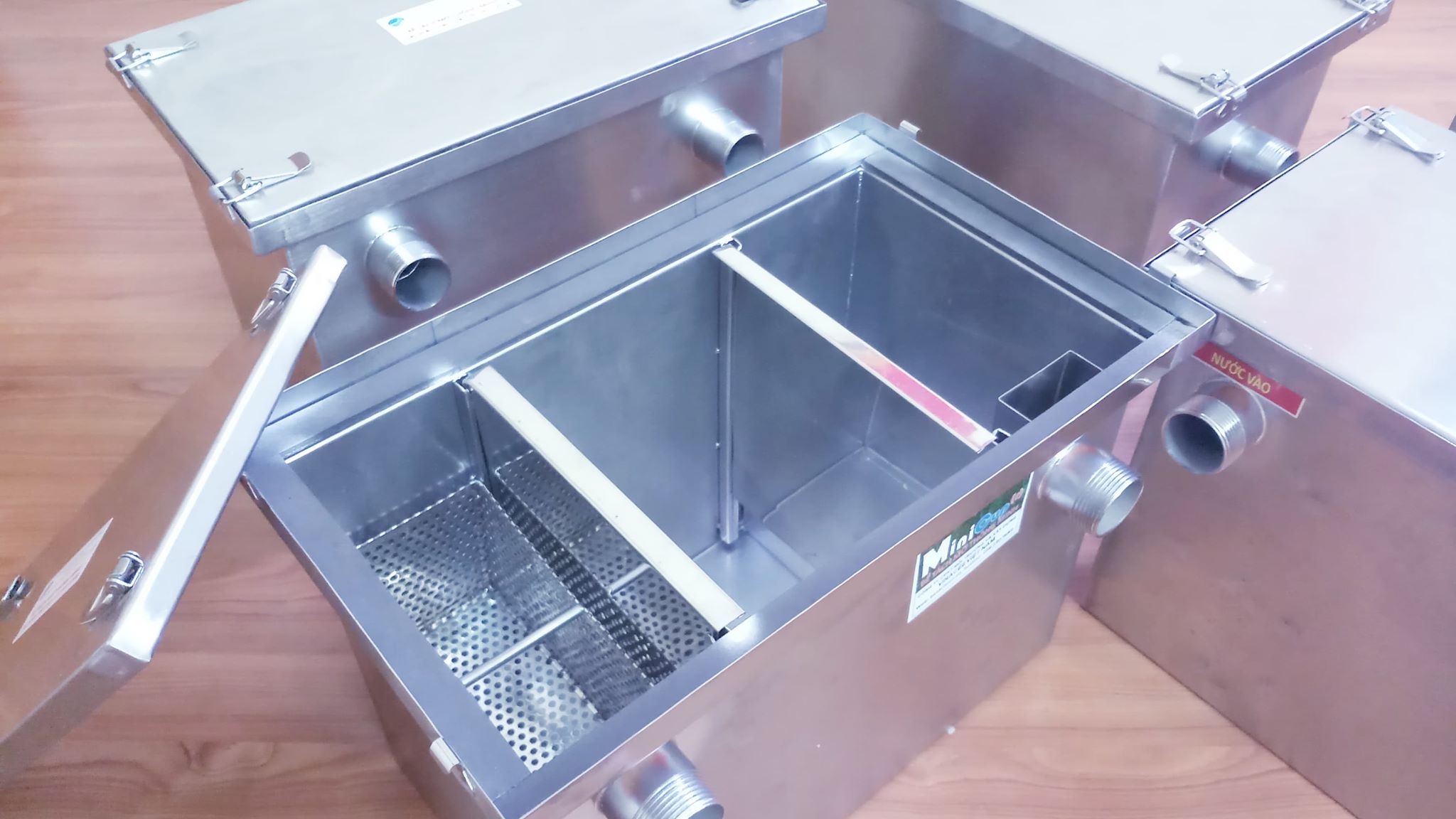Bể tách mỡ (bể tách mỡ inox - bồn lọc mỡ) được thiết kế khoa học, công nghệ hiện đại được cắt gấp bằng máy thủy lực, che mối hàn bằng khí Agon tránh hiện tượng Oxy hóa. Các mối hàn TIC liền mặt và gờ cạnh.