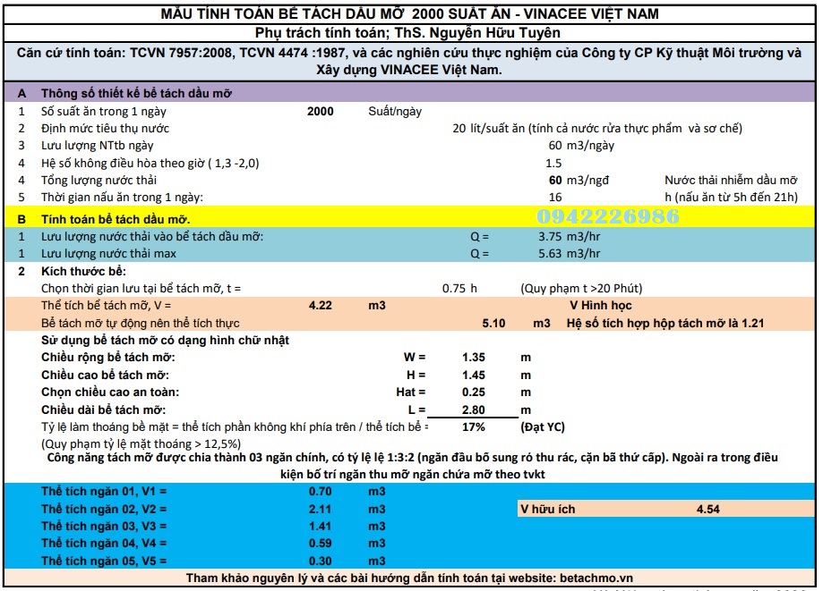 Bể tách mỡ bê tông được tính toán theo Quy chuẩn cấp nước và công trình hoặc tiêu chuẩn thiết kế bể tách mỡ. Tuy nhiên đây là những tài liệu khá cũ, việc tính toán theo số suất ăn giờ cao điểm lớn nhất là rất khó xác định. Vì quá trình mỡ phát sinh ngay từ khi chế biến đến khi rửa đĩa chén mà chúng ta cần xem xét toàn diện. Đặc biệt phương pháp này không đề cập đến chủng loại mỡ, chất tầy rửa, nhiệt độ của mỡ…vì vậy việc tính toán cần được tư vẫn bởi những đơn vị thật sự có kinh nghiệm trong lĩnh vực kỹ thuật này.