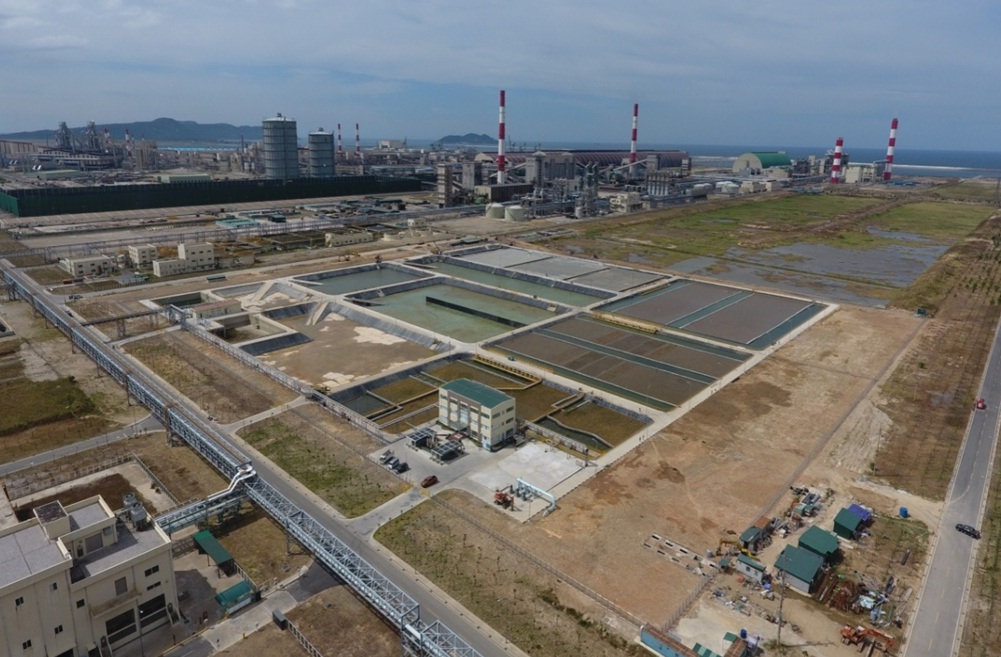 Hệ thống hồ sinh học FHS, công suất 36.000 m3/ngày, có chức năng kiểm soát sự cố, chỉ thị sinh học, và xử lý bổ sung 2 dòng nước thải sau trạm XLNT sinh hóa (xử lý nước thải từ xưởng luyện cốc, công suất tối đa 5.000 m3/ngày) và sau trạm XLNT công nghiệp (xử lý các loại nước thải sản xuất, nước thải sinh hoạt, công suất tối đa 31.000 m3/ngày). Tổng diện tích hệ thống hồ gồm 10 héc ta, với những chức năng chính: Dung tích chứa đủ lớn, cho phép chủ động áp dụng các giải pháp ứng phó khi có sự cố từ các trạm xử lý nước thải; Có thả cá - chỉ thị sinh học, cho phép kiểm chứng để đảm bảo nước thải không làm chết cá,trước khi xả ra biển. Cải thiện chất lượng nước, giảm thiểu các chất ô nhiễm, ổn định chất lượng dòng nước sau xử lý, tránh các cú sốc về nồng độ đối với môi trường biển. Tạo cảnh quan, sinh thái cho Nhà máy và khu vực xung quanh; là nơi tiến hành các hoạt động tập huấn, tuyên truyền, nâng cao nhận thức về BVMT cho nhân viên và công chúng.