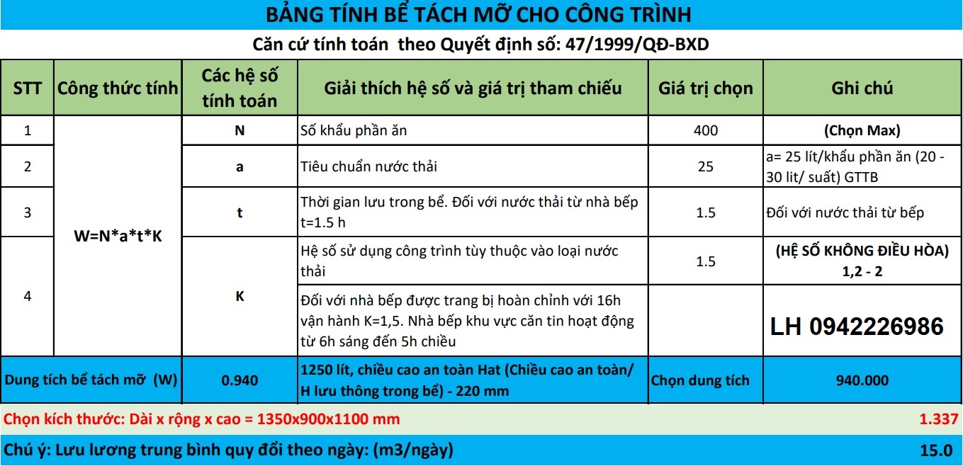 Hướng dẫn tính toán thể tích bể tách mỡ theo Công thức do Bộ xây dựng ban hành