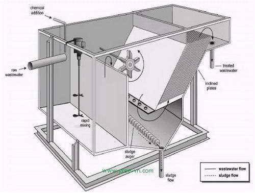 Tại đây, hóa chất nâng keo tụ và trợ lắng được châm vào, các bông cặn hình thành và chảy vào ống trung tâm bể lắng, dưới tác dụng của trọng lực, các bông cặn lắng xuống dưới đáy bể và xả định kỳ ra sân phơi bùn, phần nước trong sau lắng được chảy vào bể khử trùng.