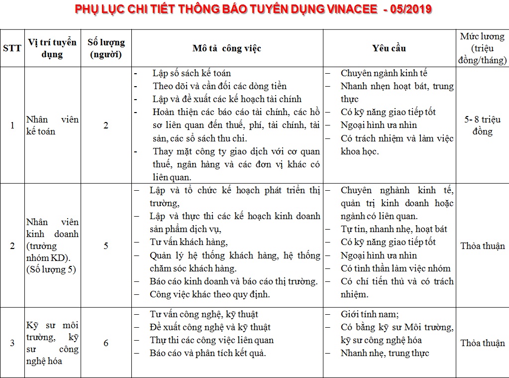 Thông báo tuyển dụng Quý 2 /2019 VINACEE Việt Nam