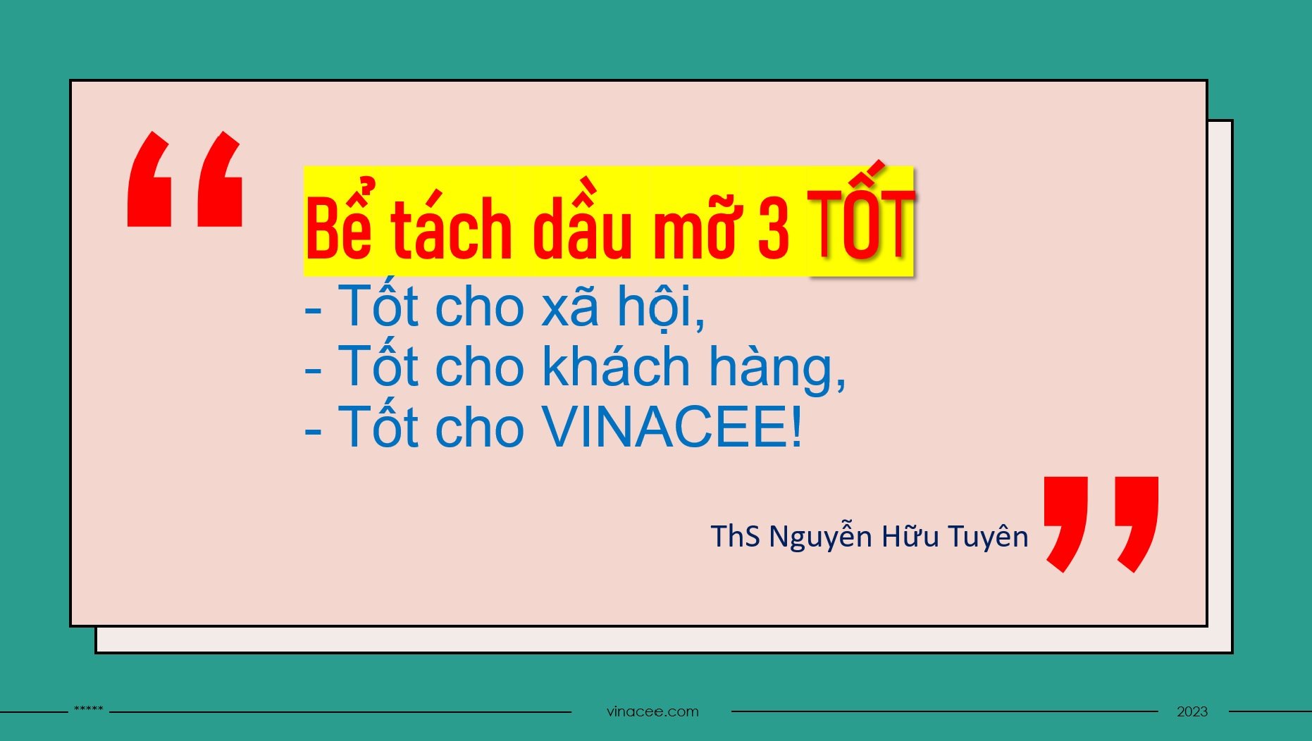 Tai Việt Nam, VINACEE tự hào là đơn vị tiên phong và là số một thị phần sản xuất và cung cấp bể tách mỡ công nghiệp cho các dự án. Các sản phẩm của VINACEE Việt Nam là kết quả nghiên cứu, cải tiến thiết bị của một đội ngũ cán bộ chuyên môn có kinh nghiệm và tay nghề cao trong lĩnh vực Công nghệ hóa môi trường, cấp thoát nước và chế tạo cơ khí, để tạo ra các sản phẩm có tích ứng dụng cao, phục vụ nhu cầu cuộc sống, quý khách hàng.